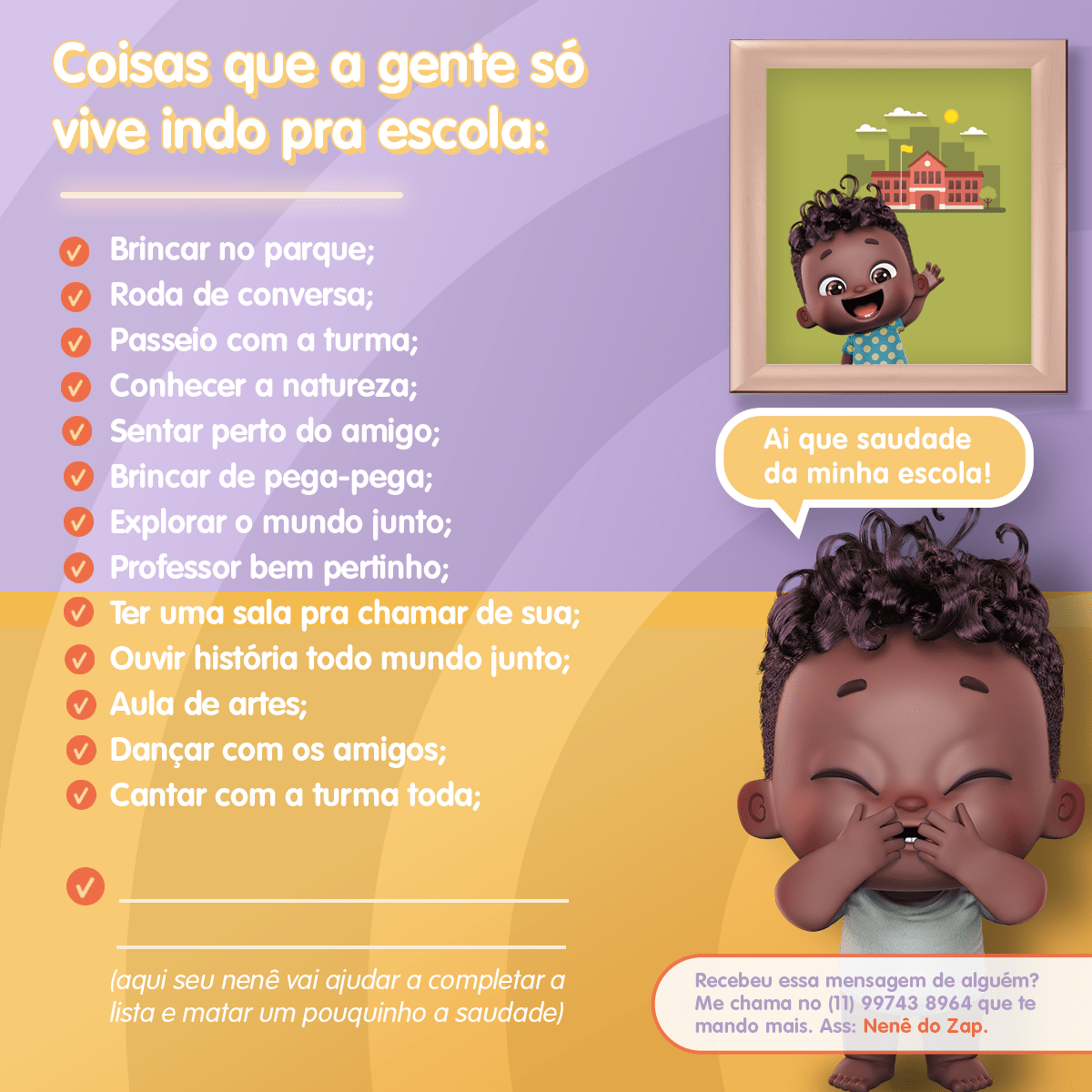 Tô com saudade da minha professora, das brincadeiras, do recreio, dos meus amiguinhos....e o seu nenê, tá assim também?