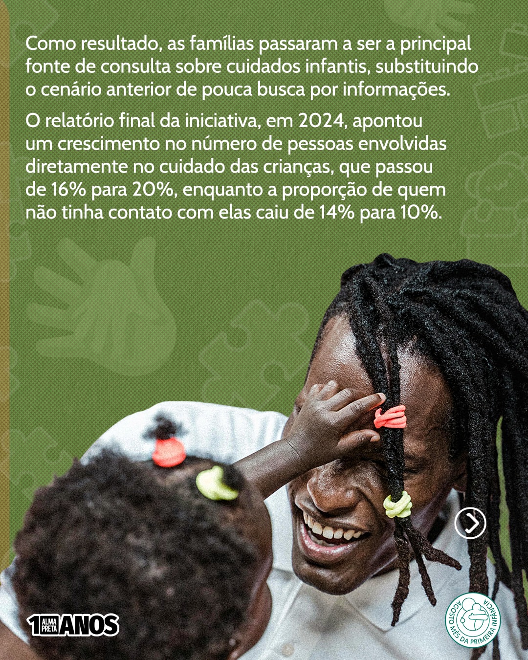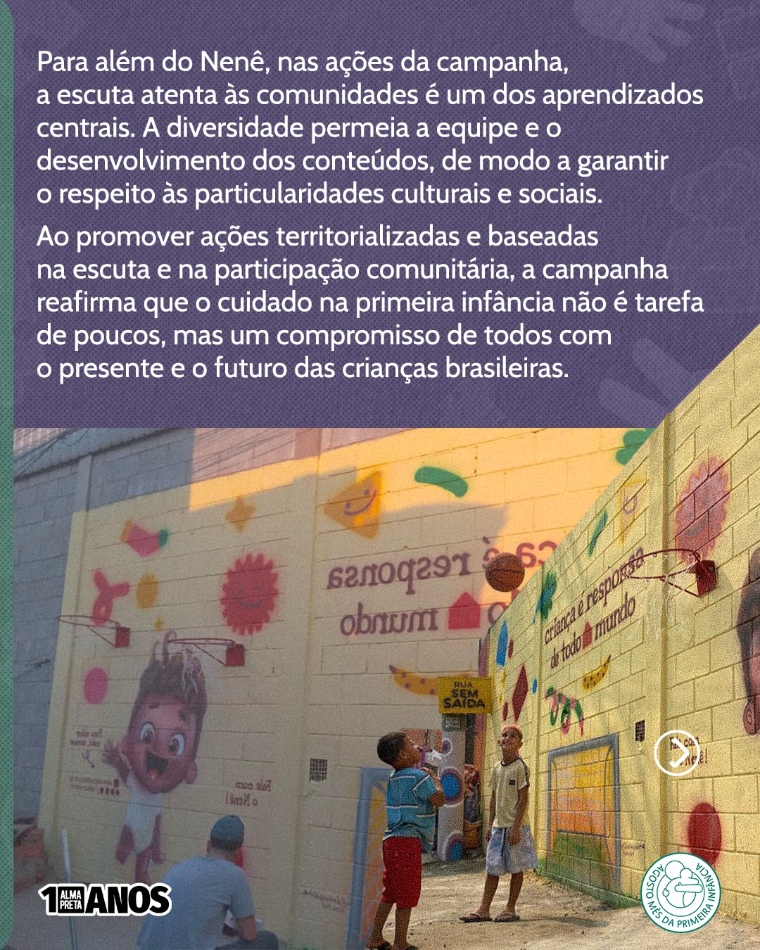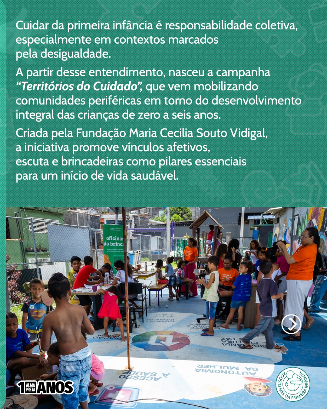 A partir desse entendimento, nasceu a campanha “Territórios do Cuidado”, que mobiliza comunidades periféricas em torno da valorização da infância, especialmente dos zero aos seis anos. Criada pela Fundação Maria Cecilia Souto Vidigal, a iniciativa aposta em vínculos afetivos, escuta ativa e brincadeiras como pilares para um começo de vida saudável.