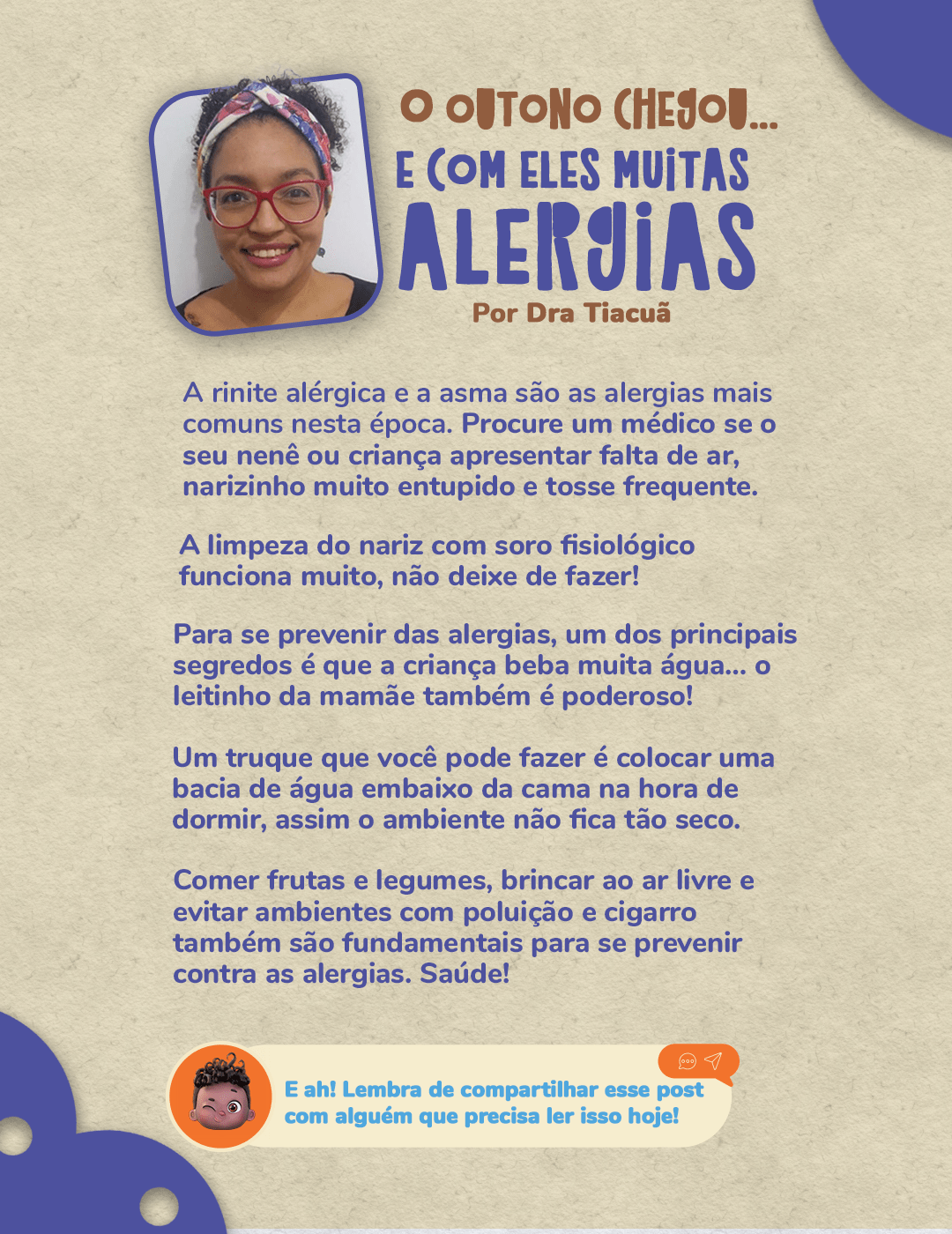 O outono chegou…e com ele, muitas alergias. Que tal tomar algumas atitudes para prevenir que o seu nenê ou criança fique doente? Chamei a Dra @tiacua.pediatra para dar umas dicas bem legais pra gente, passa pro lado e confere!