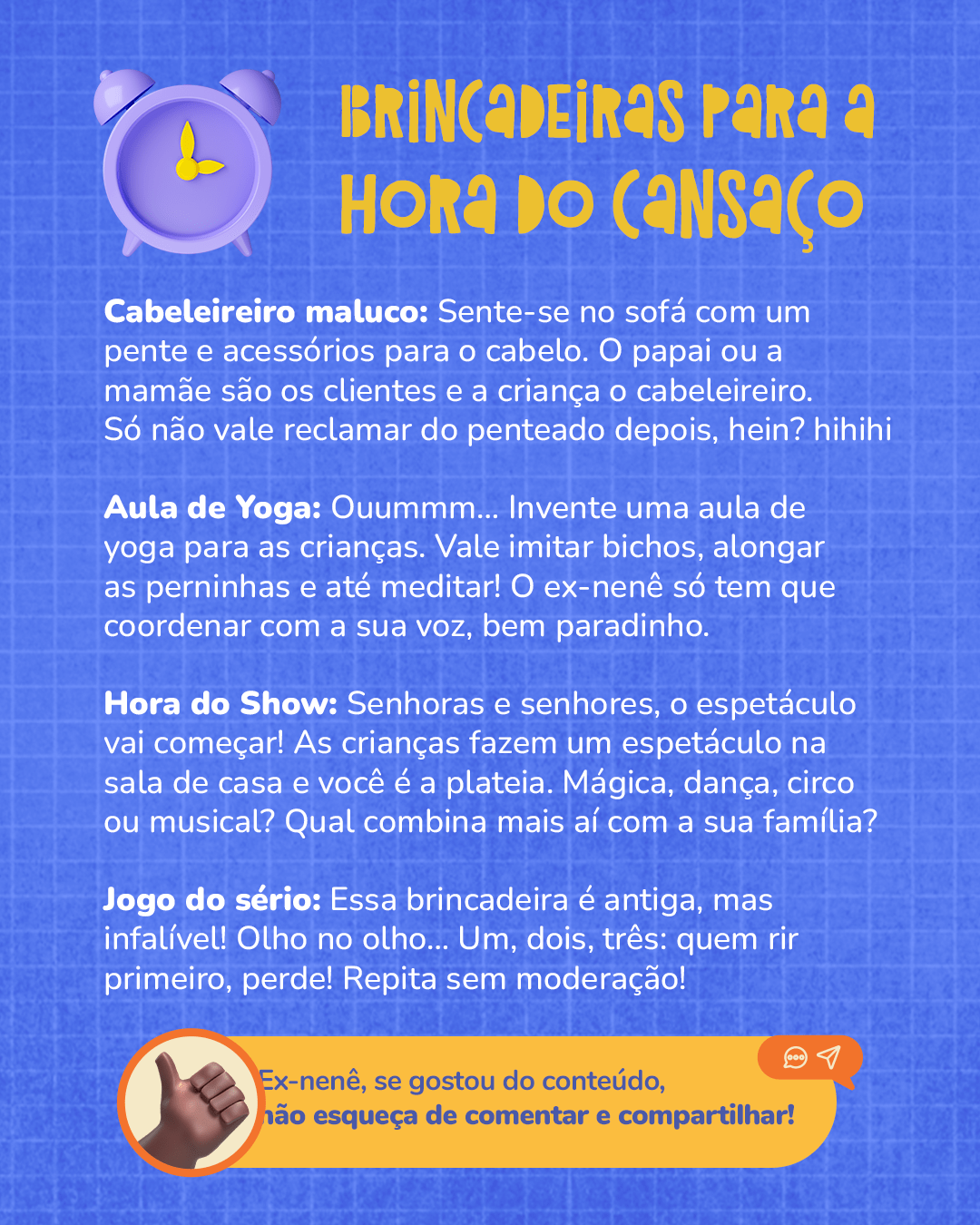 Crianças cheias de energia e papais e mamães super cansados… Será que esta combinação dá certo? Trouxe aqui umas ideias de brincadeiras para esse momento! E de naaaada, ex-nenês! hihihhi