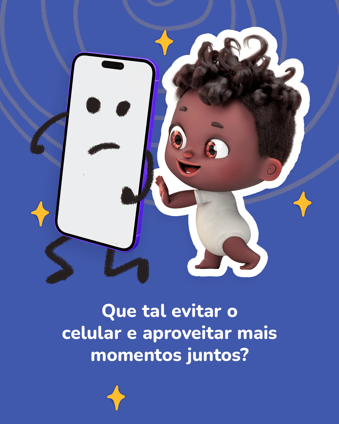Celular não é brincadeira de nenê!Nenês e crianças precisam de interações de verdade com os seus cuidadores para crescerem felizes e saudáveis.Que tal trocar o uso das telas por mais momentos juntos? Seu nenê adora!