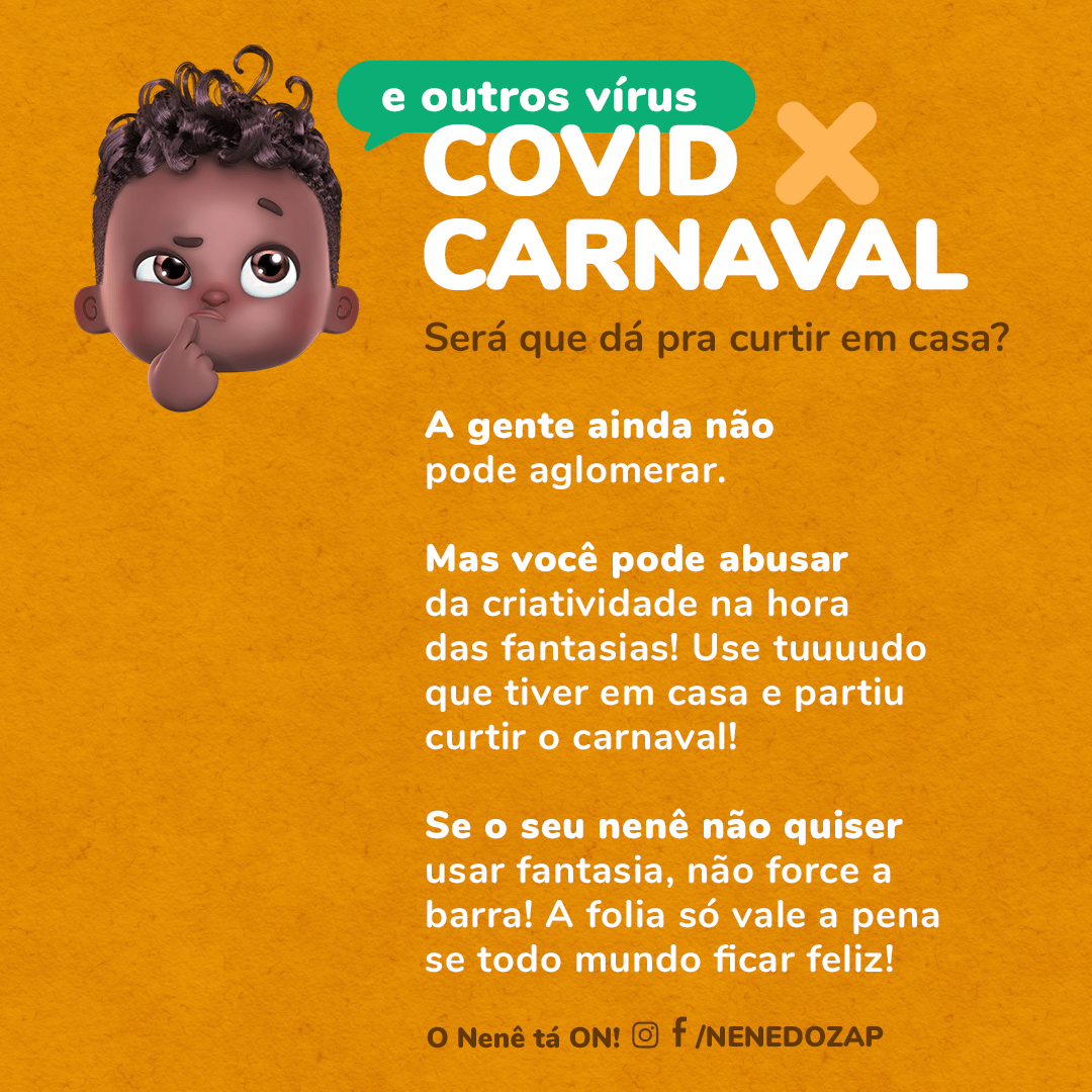 Oi, ex-nenês! Vocês já estão nos preparativos para o carnaval? Aqui em casa nós temos um bloquinho chamado: Bloco do Fique em Casa e esse ano vamos arrasar nas fantasias! Minha mamãe vai caprichar usando papelão e jornais, já me sinto pronto!