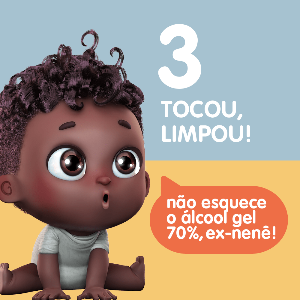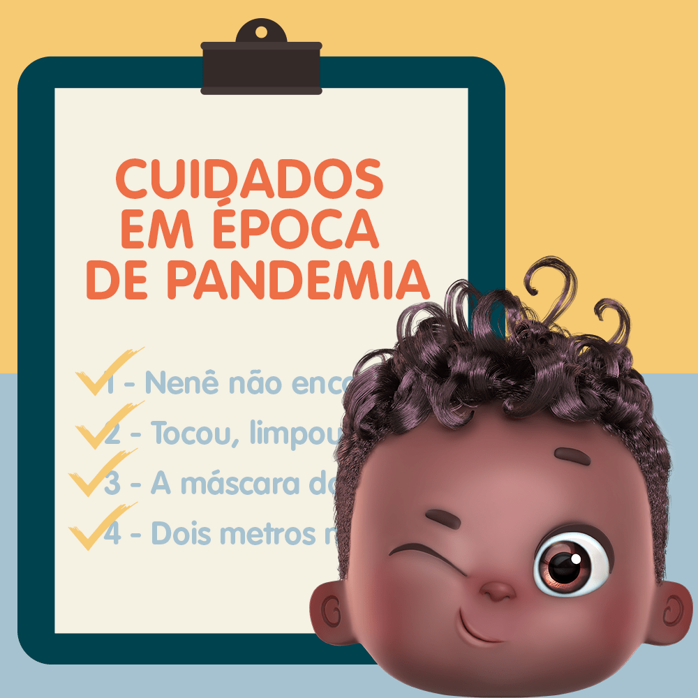 Fala família! Até eu que sou nenê já entendi que as coisas lá fora podem até parecer normais de novo, mas na verdade continuam meio esquisitas! Esse vírus ruinzão ainda tá solto por aí, e a gente é que não vai dar mole pra ele, certo? Vale pros ex-nenês, e vale pra gente! Eu tava pensando aqui… um bom jeito de ensinar a nenezada a se manter protegida é com brincadeiras! Se liga, que vou te ensinar duas brincadeiras: a do saiu-cobriu e a do tocou-limpou!