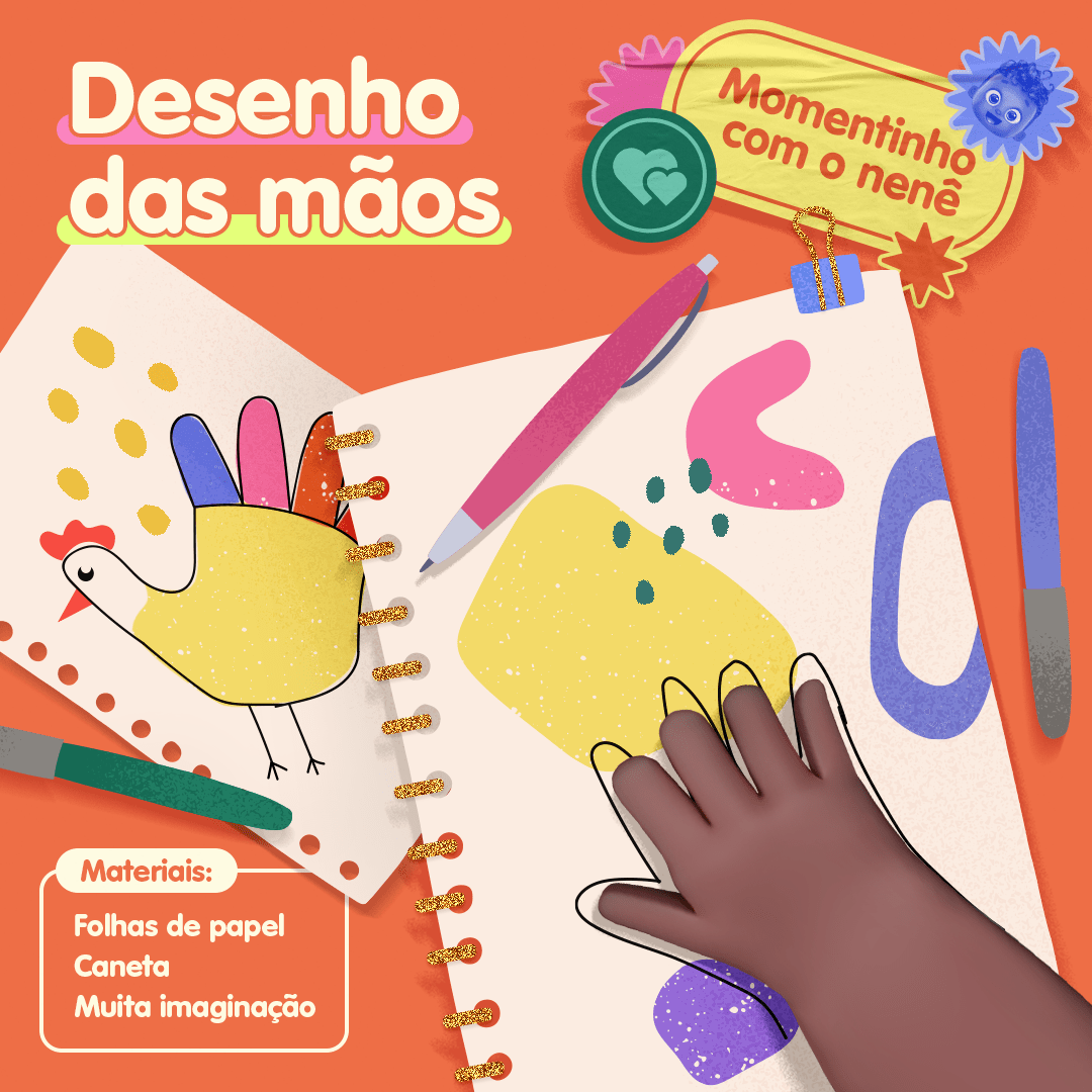 Eu trouxe essa ideia aqui de brincadeira que é bem simples mas muito legal, que é cada um desenhar a mão do outro no papel! Vai ser uma atividade só de vocês dois bem legal!