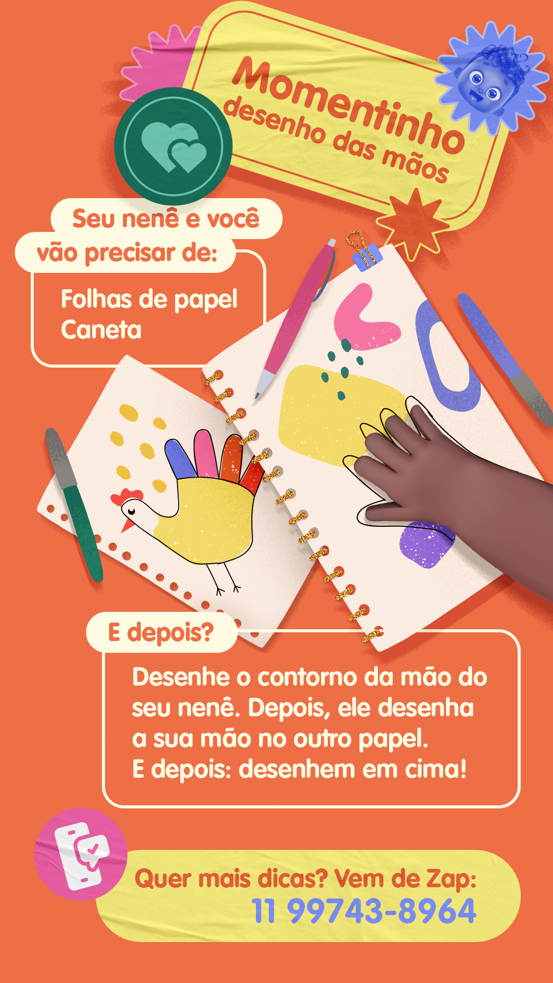 Primeiro você desenha a do seu nenê. E, depois, ele desenha a sua. Daí dá pra inventar o que quiser em cima dos desenhos! Muito Legal né?