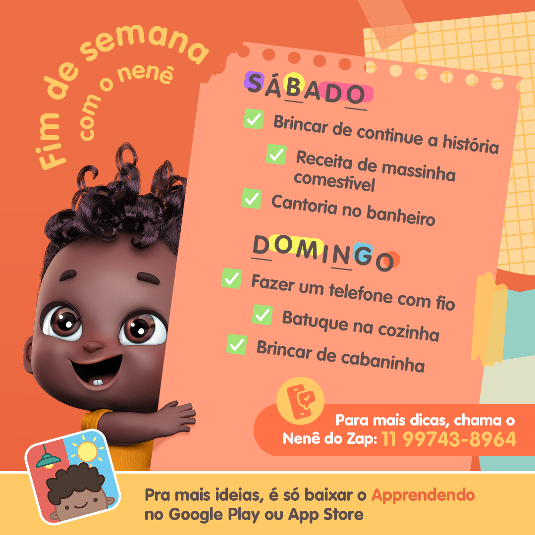 Ex-nenê, às vezes falta criatividade pra inventar umas brincadeiras pra nenezada, né? Lá em casa a gente descobriu um aplicativo bem legal que tem um monte de ideias, dicas e atividades pra fazer com seu nenê, chama Apprendendo. É só baixar nas loja de aplicativo do seu celular. É de graça!