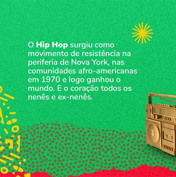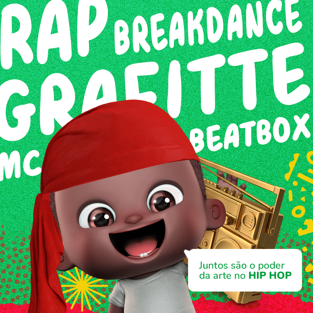 Mc Nenê na área. E hoje o papo é reto e cheio de ritmo. Você sabia que o hip hop é um movimento que mistura vários ritmos como o jazz, funk, o rock e pop? Então, Solta o som DJ e partiu improvisar umas rimas! ??