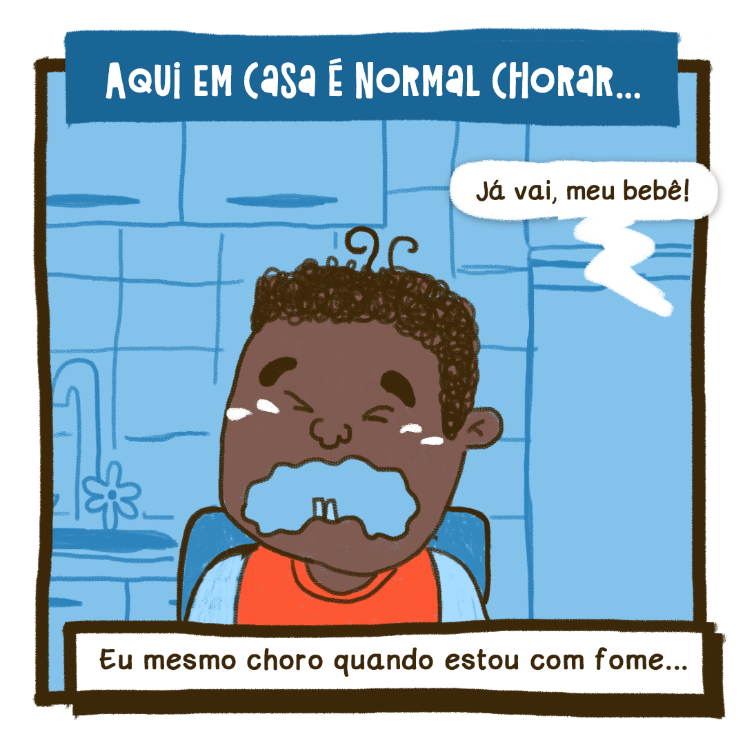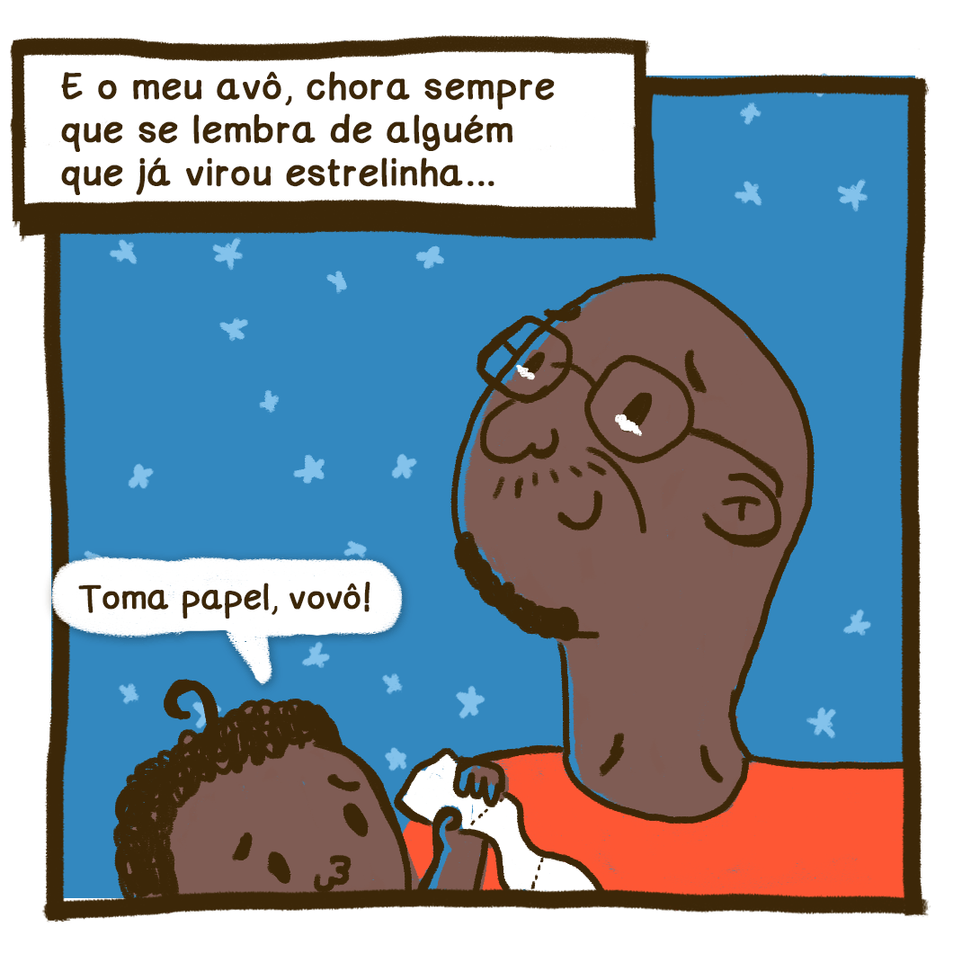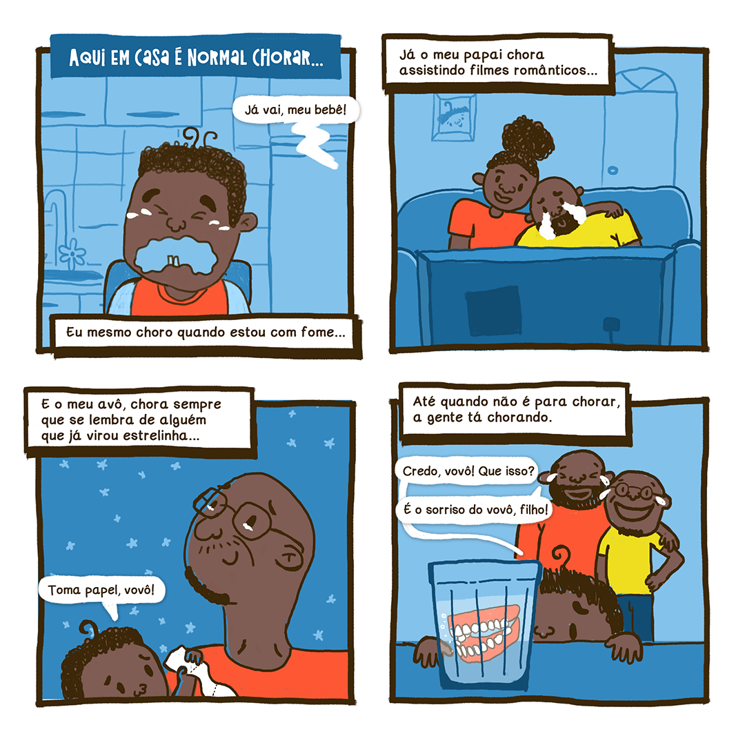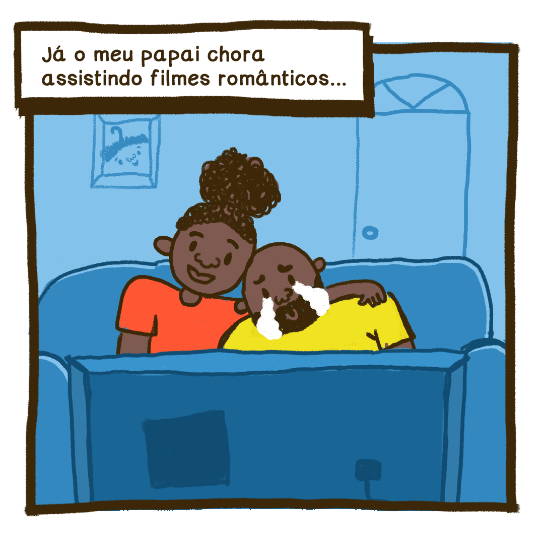Meu papai e meu avô me ensinam todos os dias que homens choram sim e pode ser por uma tristeza grandona ou algo pequenininho, tá?