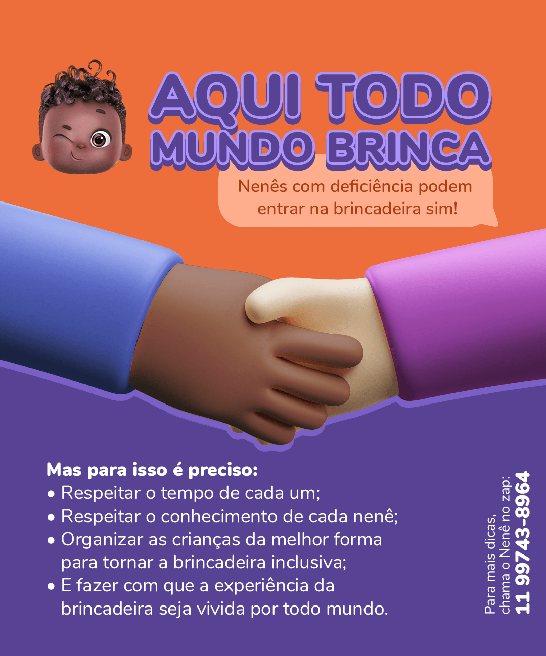 O mundo dos adultos faz parecer que “ser diferente” pode ser um problema, mas para nós os nenês, conviver com o diferente nos ajuda a respeitar o outro e nos torna mais solidários. Por isso na minha escolinha e na minha rua, todo mundo brinca junto. E a brincadeira não precisa ser igual. A gente coloca a criatividade pra jogo e faz tudo diferente e divertido. Todo nenê tem toda a capacidade de brincar, vocês adultos só precisam nos ensinar, ter paciência para respeitar as diferenças e o tempo de cada um. Vamos incluir, para evoluir!