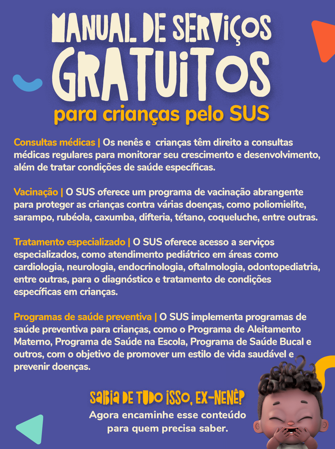 Com saúde não se brinca, né não, ex-nenês? Então, se liga que o SUS oferece um montão de serviços gratuitos para os nenês e crianças crescerem saudáveis.
