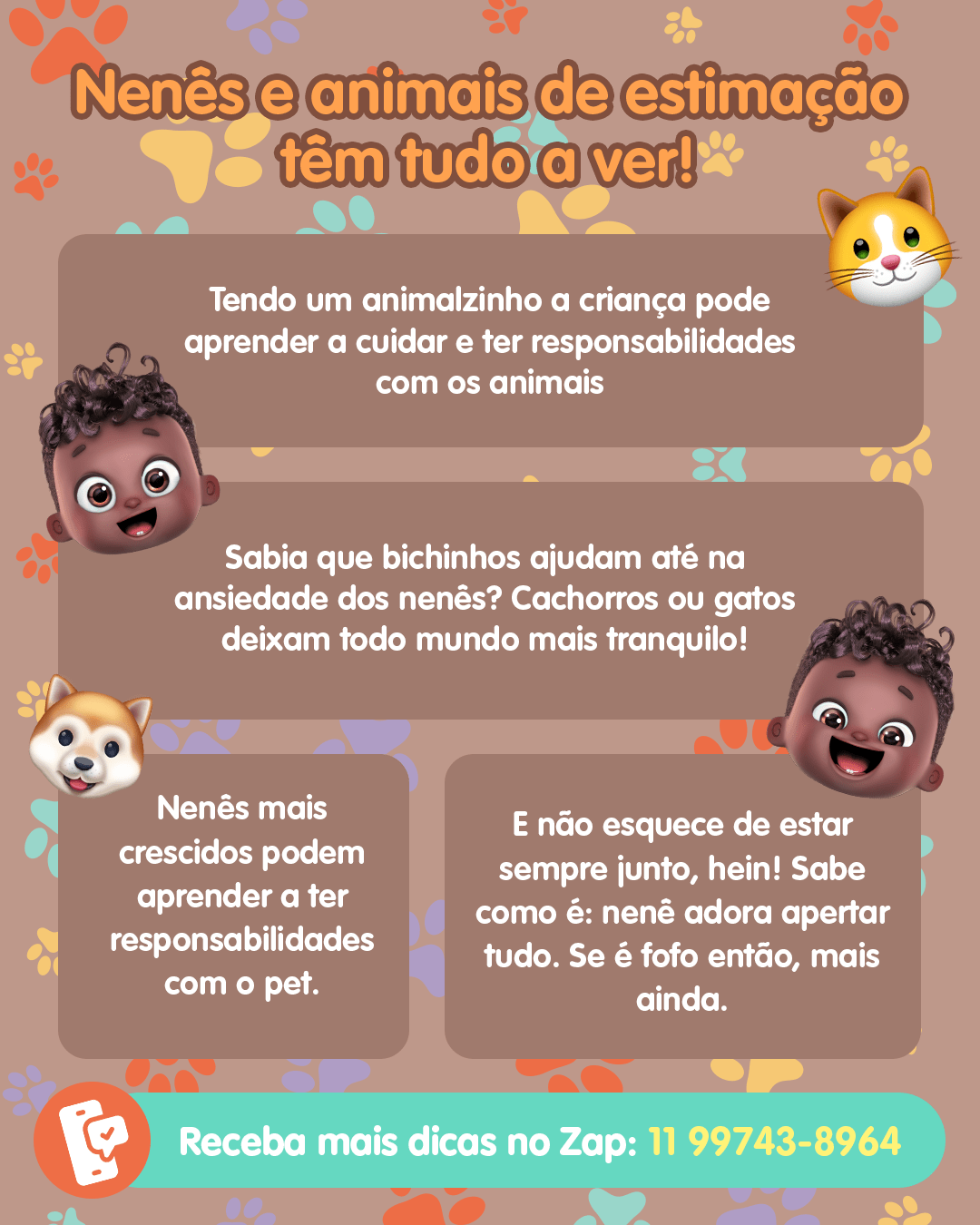 Tem várias pesquisas que confirmam que essa relação nenê e pet faz suuuuuper bem pro nosso desenvolvimento. Mas é legal vocês adultos sempre estarem por perto pra cuidar da brincadeira, hein. Porque, sabe como a gente né: adora cutucar, abraçar e não soltar mais, enfiar dedo no olho hihihi