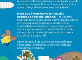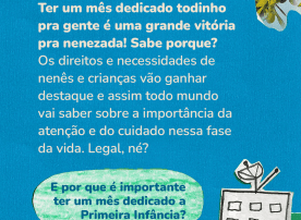 Ter um mês dedicado todinho pra gente é uma grande vitória para a nenezada, pois os direitos e necessidades de nenês e crianças vão ganhar destaque e assim todo mundo vai saber sobre a importância da atenção e do cuidado nessa fase da vida. Legal, né? Além disso, é um avanço ter esse mês que vai priorizar programas e serviços voltados para nenês e crianças.
