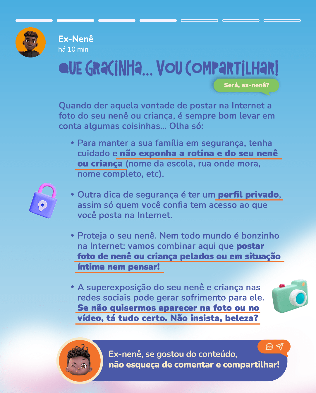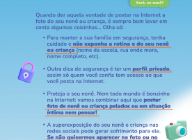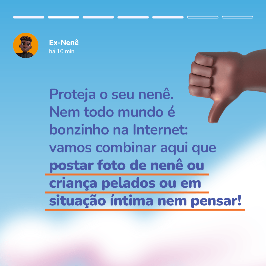 Os nenês e as crianças são muito fofinhos e dá mesmo muita vontade de espalhar pelo mundo as nossas fotos e vídeos, né? hihih Mas atenção: assim como os adultos têm direito a privacidade, nós nenês e crianças, temos também. Além disso, compartilhar a nossa intimidade pode nos colocar em risco, sabiam?