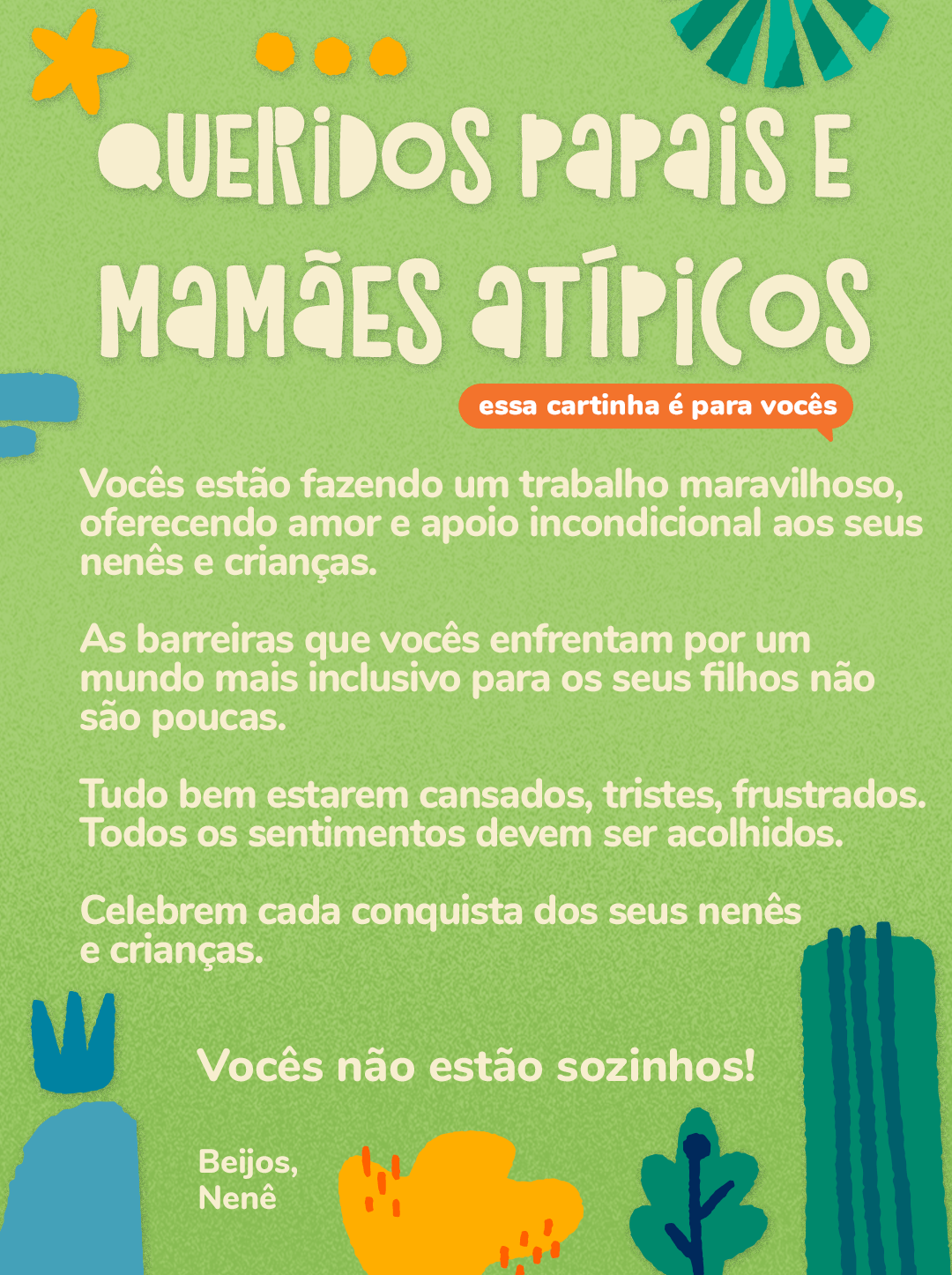 Eu tô passando aqui para dar um abraço beeeem apertado em vocês, dizer que vocês estão fazendo um trabalho maravilhoso! Que vocês sempre tenham força e, claro, muito apoio para enfrentar as barreiras e que consigam encontrar leveza para celebrar as pequenas-grandes vitórias do dia-a-dia. Vocês são demais, viu? Não esqueçam!