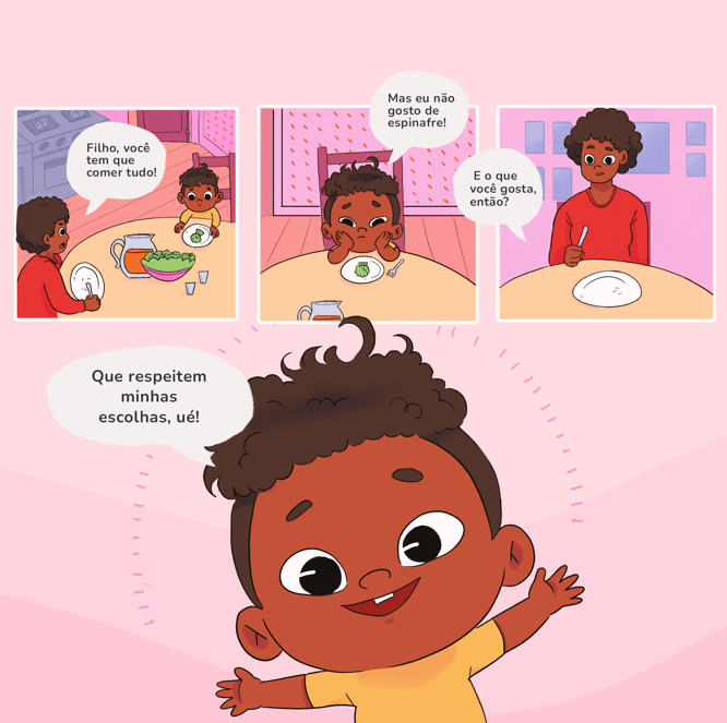 A minha mãe vive falando sobre respeito, mas às vezes ela esquece que eu também mereço ser respeitado! Então, fica o questionamento: por que quando um adulto não gosta de uma comida ele pode deixar de comer e uma criança não pode fazer o mesmo? Já pensaram nisso?