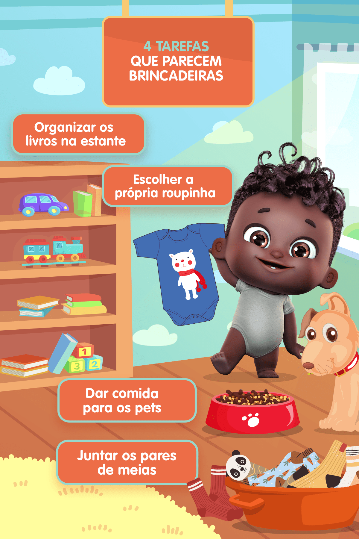 Eu tô aprendendo a fazer isso aos pouquinhos, já dou comida pro auau, ajudo a mamãe a separar os pares de meia e até a escolher a roupa que vou usar.